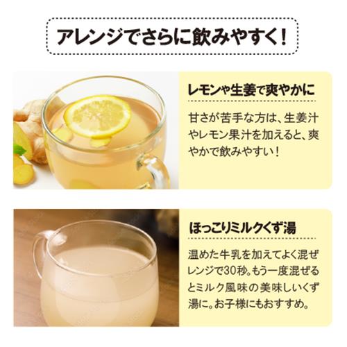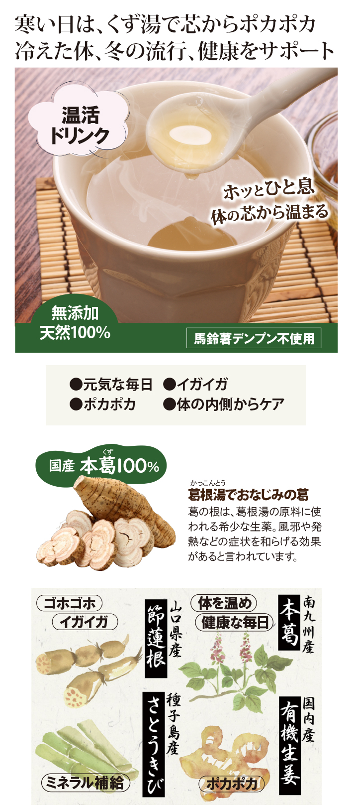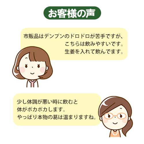 希少な国産本葛に、イガイガによい節蓮根、生姜や種子島のサトウキビを加えました。ほんのり葛のトロミとやさしい甘さで体の芯から温まります。安価な馬鈴薯デンプンは不使用です。寒い日にどうぞ。