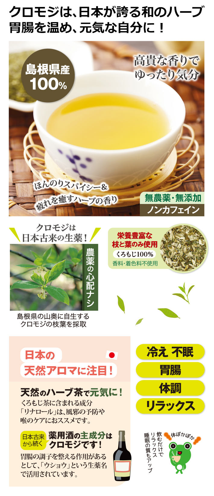 クロモジは香りや薬効の豊かさで、古くから香木や楊枝などに利用されてきました。その葉や枝にたっぷり含まれる成分が健康に良いといわれています。胃腸を整え、身体もぽかぽか。眠りが浅いとお悩みの方は、おやすみ前に一杯お飲み頂くのがおススメです。ノンカフェインで安心です。
