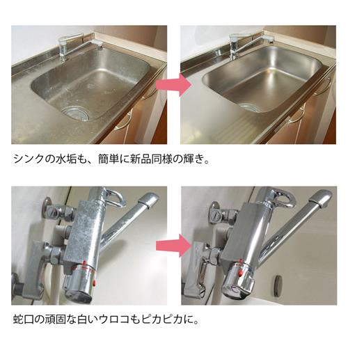 浴室の鏡・窓・I H調理器などのガラス面、シンクなどのステンレス製品、 タイル・便器などの陶磁製品、ホウロウ製品、御影石や大理石などに付着した 水垢・油膜の除去。コゲつき、茶しぶ、サビ取り。