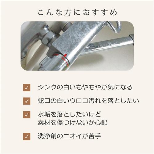 鹿児島県のシラス台地(火山灰が堆積)から採取した微粒子シラスを、高温で発泡させて生まれたシラスバルーンを使用。水垢と素材のわずかな隙間に入り込み、汚れを吸着しながらやさしく剥がします。天然由来素材で、中性・無臭。刺激を感じにくい処方です。素材を変質させにくく、磨き上げたような自然な光沢感に整えます。