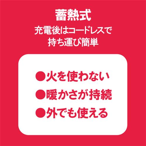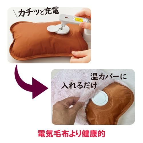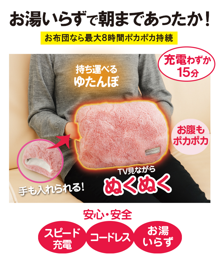 お湯を使わず、充電して使える蓄熱タイプのあったか湯たんぽ。約15分の充電で最大8時間ぽかぽか。冷え込む日は昼間も使えて便利です。モコモコのカバーは手触りがよく、手も入れられるので、暖かく過ごせます。
