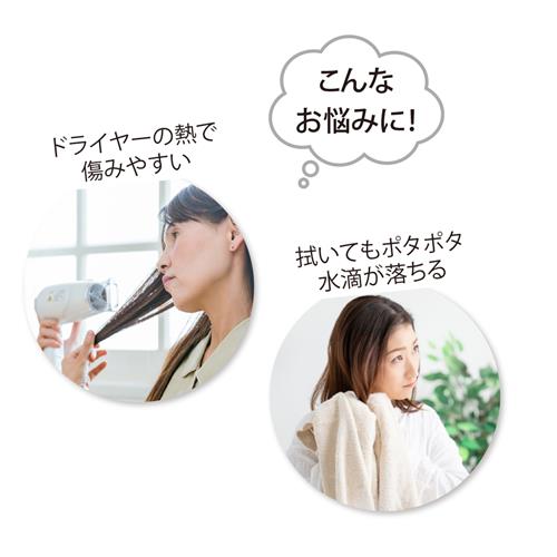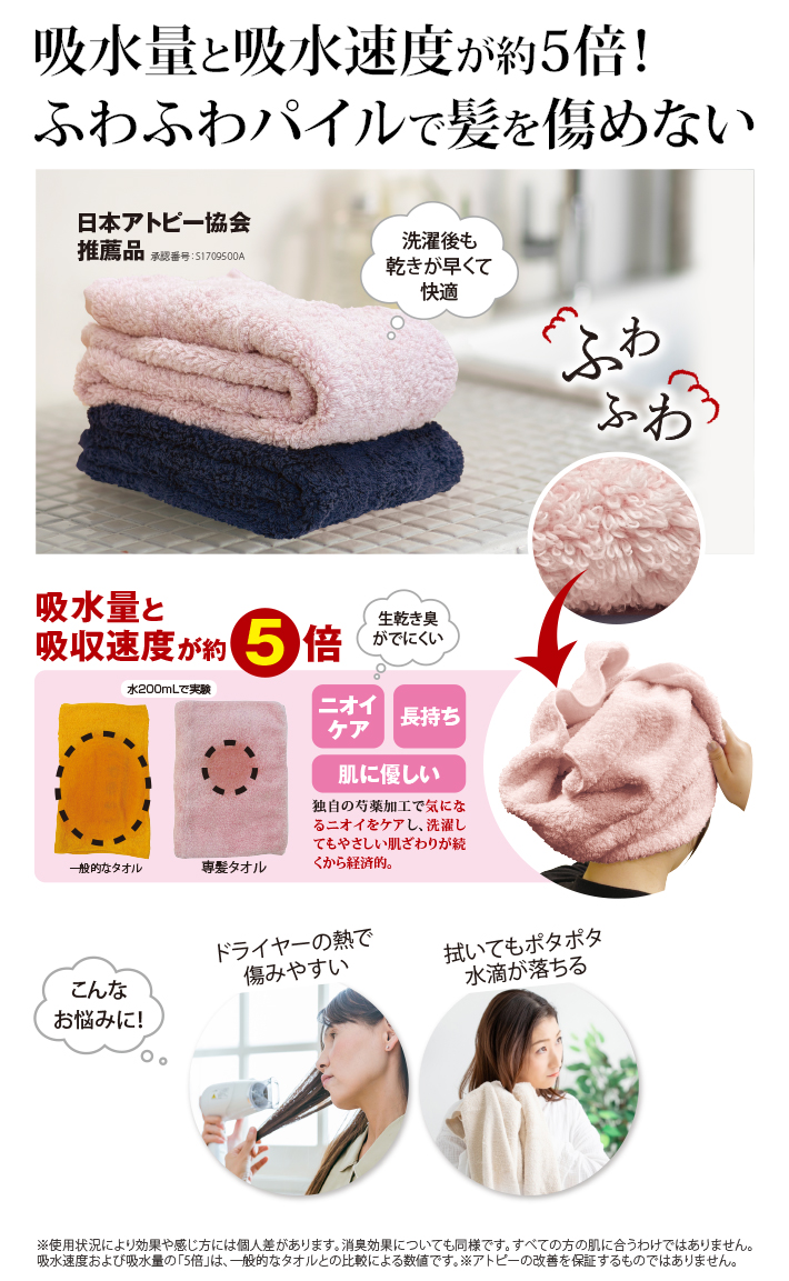 100年の伝統と特許技術から生まれた「専髪タオル」は「吸水スピード」と「吸水量」にこだわった上質なタオル。一般のタオルと比べて吸水量とスピードは約5倍。水分をサッとふき取るので髪への負担が少なく、湯冷め防止にも。極上の柔らかさで髪をやさしく包み込み、乾かしながら消臭効果も発揮します。※到着後、洗わず使えます。
