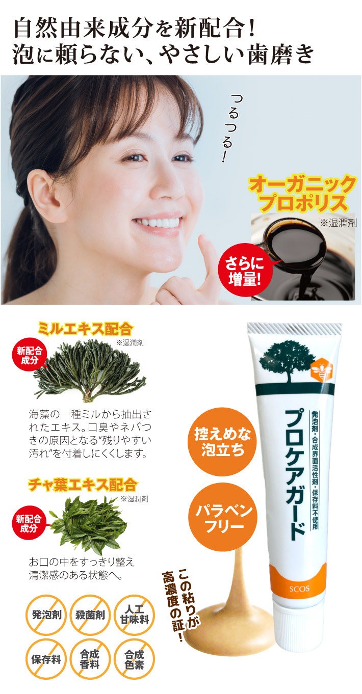 ブラジル最高峰のオーガニックプロポリスを高配合した歯みがき粉「プロケアガード」がパワーアップ。発泡剤・合成界面活性剤を使わないシンプル設計に加え、新たに海藻由来成分ミルエキスを配合。さらに、マヌカハニーやビタミンA、チャ葉エキス、クマザサエキスなどの自然由来成分をバランスよく配合し、毎日のブラッシングで口内をすっきり清潔に保ちます。従来の使い心地はそのままに、成分バランスを見直し、より心地よく使える処方へ。口内環境を整える毎日のケアにおすすめです。毎日使うものだからこそ、余計なものをできるだけ使わない無添加設計。発泡剤不使用で泡立ちに頼らず、丁寧に磨けます。電動歯ブラシにもおすすめです。