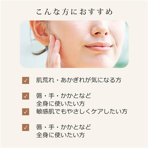 肌にのせると体温で溶けて、なじみます。 適量を手に取り、顔や唇、手肌、ボディ等、気になる部分に塗り込んでください。 気温が低いと硬くなります。指の腹でくるくるなでて、表面を少し軟らかくしてお使いください。
